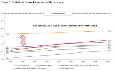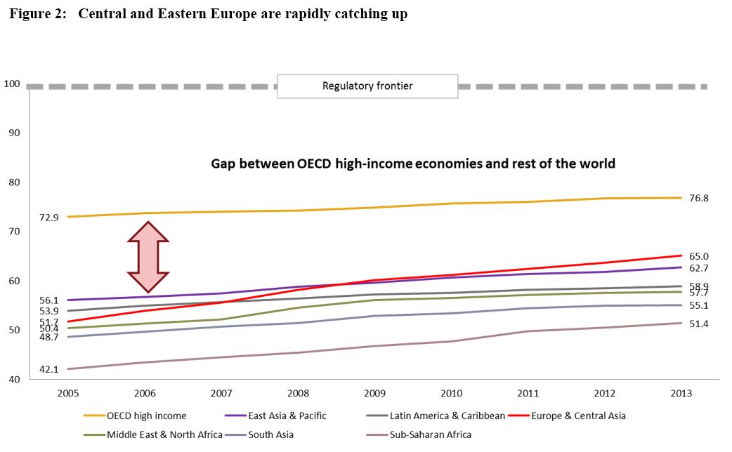 There is another way to look at the convergence story. The graph below shows, for every region of the world, the evolution of the Doing Business “distance to the frontier” metric, a measure of the gap to best business practices in the world. As can be seen, the OECD is the best performing region of the world. This, in itself, is not surprising. What is notable about this chart is that ECA (Central and Eastern Europe mainly), in recent years, has overtaken other regions of the world and is now closing in on the OECD. This story has two angles. Many of these countries were engaged in significant economic and structural reforms in the period leading up to EU accession in 2004, intended to narrow the gap with respect to established EU members. After accession, countries like Poland, Latvia, Estonia, Lithuania, Slovenia and others have had to continue to reform to keep up with the likes of Sweden and Germany, tough partners and competitors. Furthermore, future members of the EU, such as Macedonia, Albania, Montenegro, and other countries in South East Europe are having to reform actively, for the same reasons as their predecessors 15-20 years ago. So, the EU has proved to be an extremely effective and powerful institutional mechanism for convergence. At a time when the EU brand has suffered because of the Euro crisis, it is important to remember that this impressive experiment of political and economic integration is having a lasting impact on all of its less privileged members, helping them to converge toward higher levels of efficiency and prosperity.